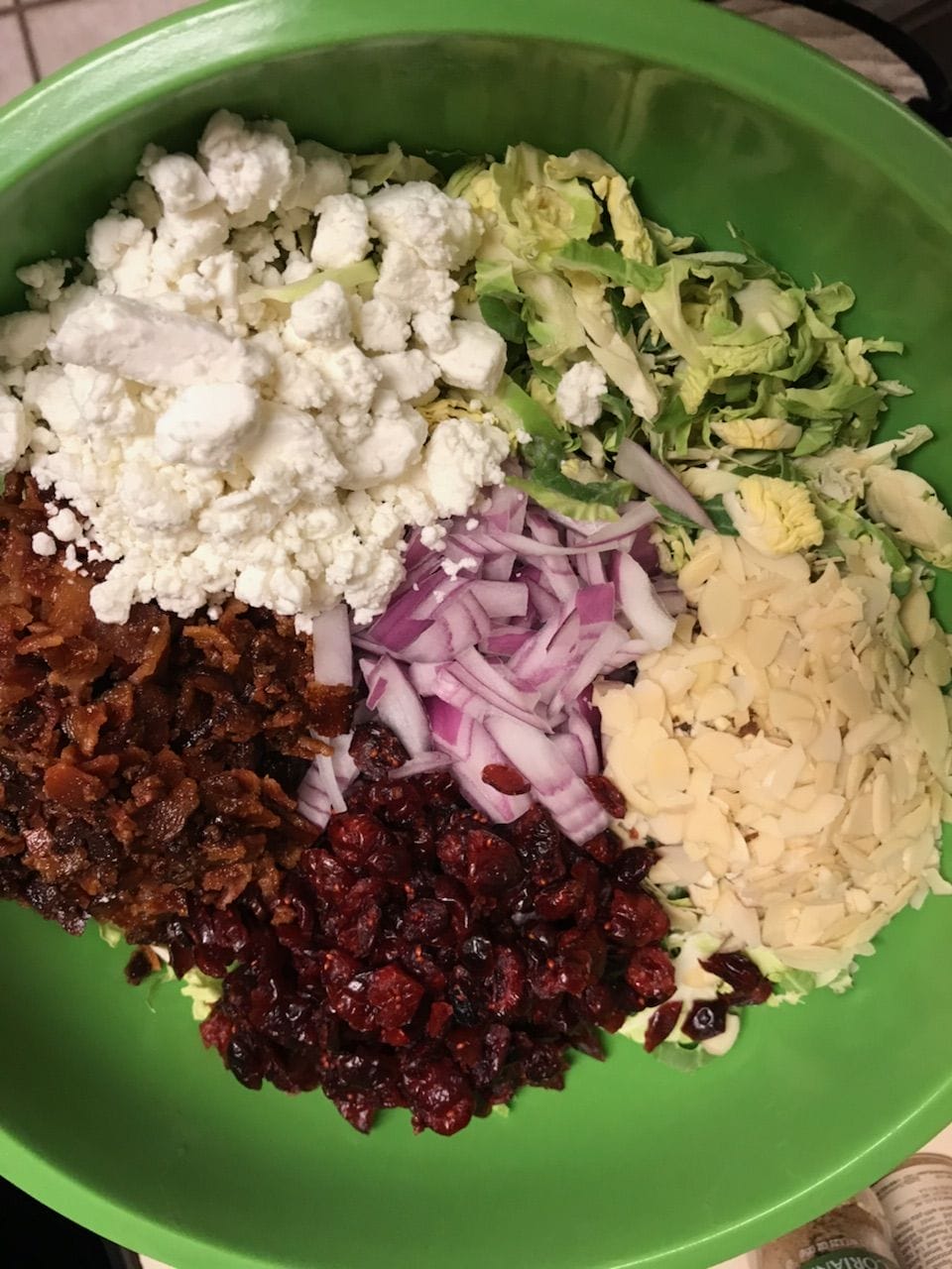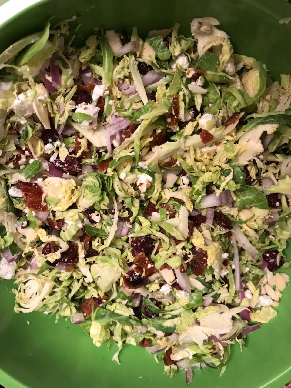 Happy Hump day! How’s your week been? If you haven’t noticed, it’s 1000 degrees outside and it’s gross…. My appetite usually drops quite a bit when it’s hot like this, but if I don’t eat, I don’t feel well so I’ve been on a mission to make healthy foods that can be served cold and have tons of flavor. This will be the second week in a row I’ve made this salad because we loved it so much so I present to you, cold Brussels Sprout Salad with GOAT CHEESE (I never turn down goat cheese y’all). This is great as a side, on it’s own, or you could even add a protein to it and make it a whole meal.