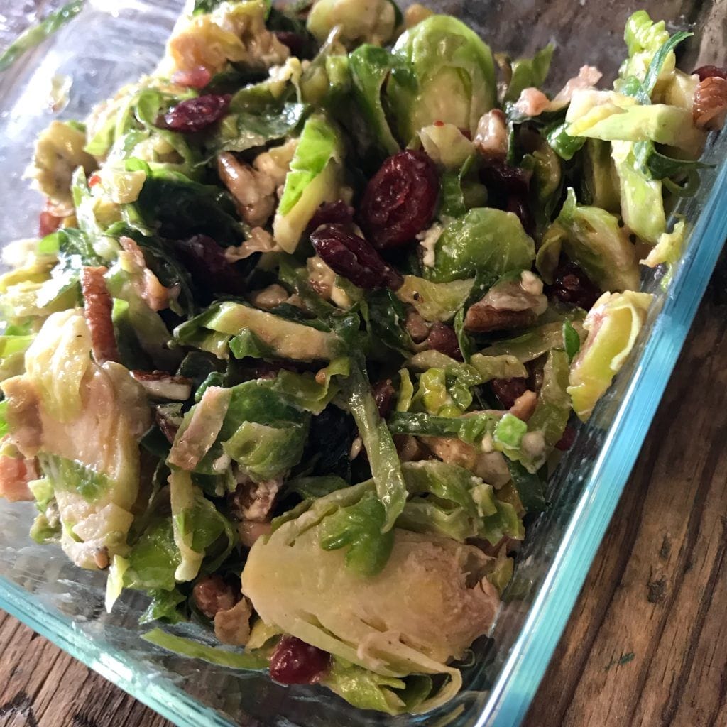 In a larger bowl, mix brussels, pecans, cranberries, and goat cheese until combined. Pour dressing over salad and mix gently to combine. Serve immediately or store in the refrigerator in a closed container.