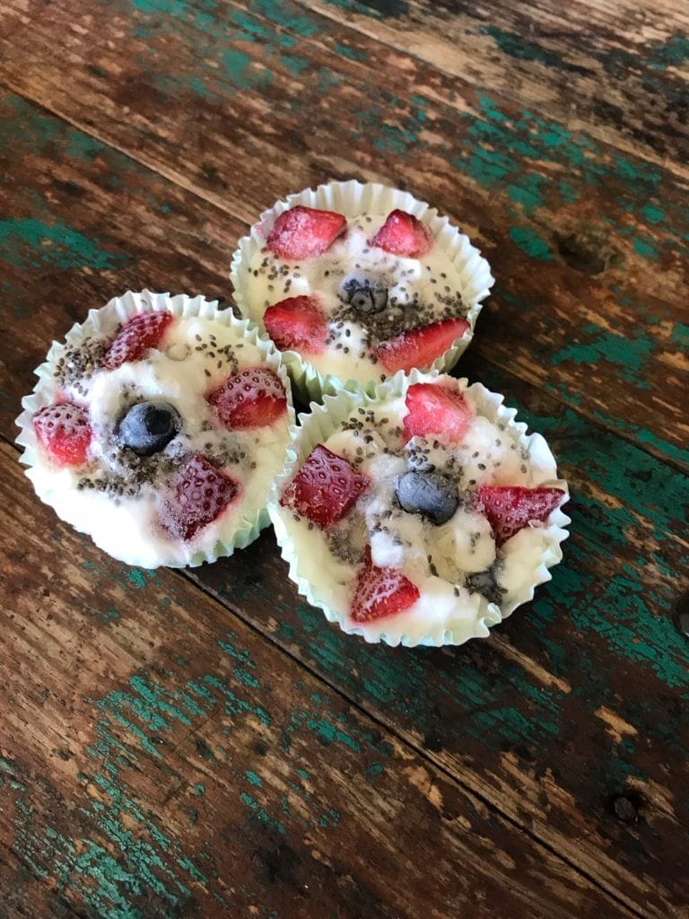 Spoon the yogurt evenly into each cup. Use a toothpick to push pieces of berries down into the yogurt. It’s fine to have some exposed too. Sprinkle with chia seeds. Other options – black berries, peaches, raspberries, any fruit really! You could use flax seed, nuts, granola, anything you like in a parfait!