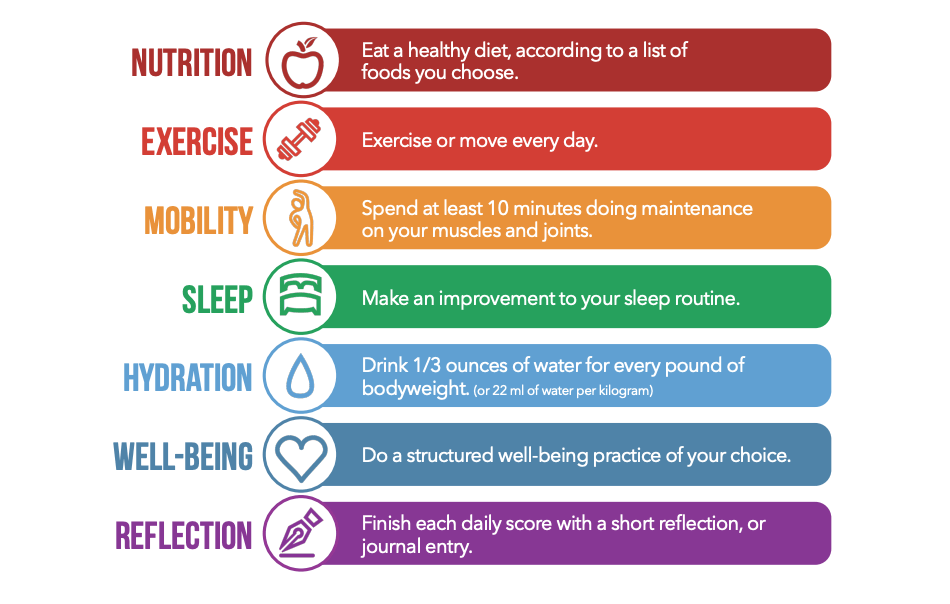 While the 7 daily habits are still in place (nutrition, sleep, exercise, mobility, hydration, reflection, and well-being) the focus is not so much on the points and trying to be perfect every day.